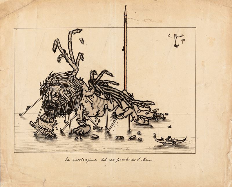 Illustrazione originale realizzata da Scalarini nel 1903 per il settimanale illustrato Merlin Cocai. "È ìl più politico dei caricaturisti italiani e forse del mondo. La sintesi è la base del suo pensiero e del suo disegno crudele. (...) La sua caricatura è veleno, è morte. Guardando queste grandi opere io mi spavento. Scalarini è un caricaturista che passerà alla storia" (Emilio Zanzi). Provenienza: collezione Caramba (Luigi Sapelli). Piega verticale al centro, pieghe e piccoli strappi ai margini. Firmata e datata.