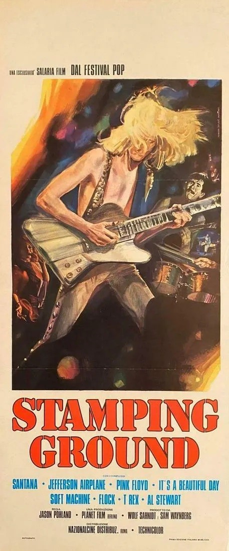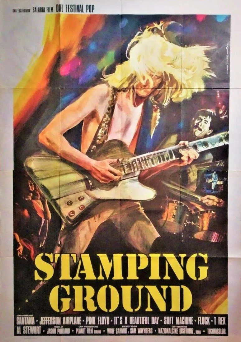 Bozzetto originale realizzato da Ferrari (Studio Paradiso) per la locandina ufficiale del film "Stamping Ground" diretto da Pohland e Sluizer nel 1971. Docufilm del leggendario concerto Holland Pop Festival di Rotterdam, che vide alternarsi sul palco rock star come The Byrds, Jefferson Airplane, Pink Floyd e Santana.