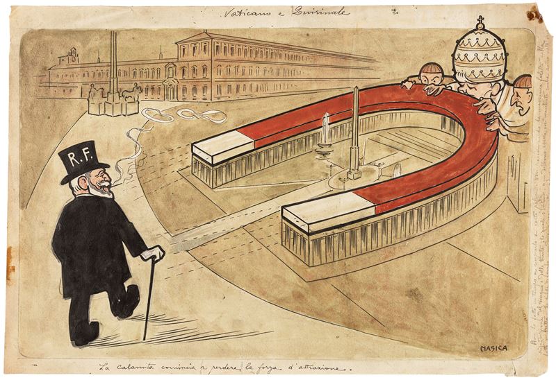Illustrazione originale realizzata da Nasica durante i primi anni del '900. << La calamita comincia a perdere la forza di attrazione. >> Maestro all'Accademia di Belle Arti di Bologna di Giorgi Morandi e Bruno Saetti, Nasica fu tra gli illustratori più apprezzati della sua epoca, definito il "caricaturista degli intellettuali", lavorò tra le altre per le riviste Italia ride, Novissima, Fantasio, La Lettura e il Secolo XX. Lievi pieghe e piccoli strappi ai margini, mancanza all'angolo superiore destro. Firmata.