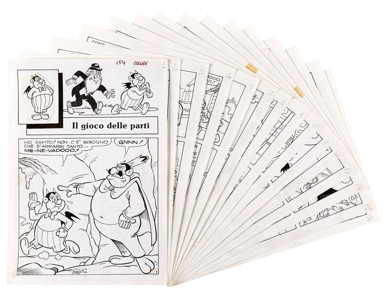 Storia completa composta da 16 tavole originali realizzate da Dossi per "Il gioco delle parti", avventura del buon diavolo Geppo pubblicata su Geppo n. 154 dalla Bianconi nel 1987. Ogni pagina firmata al retro.
