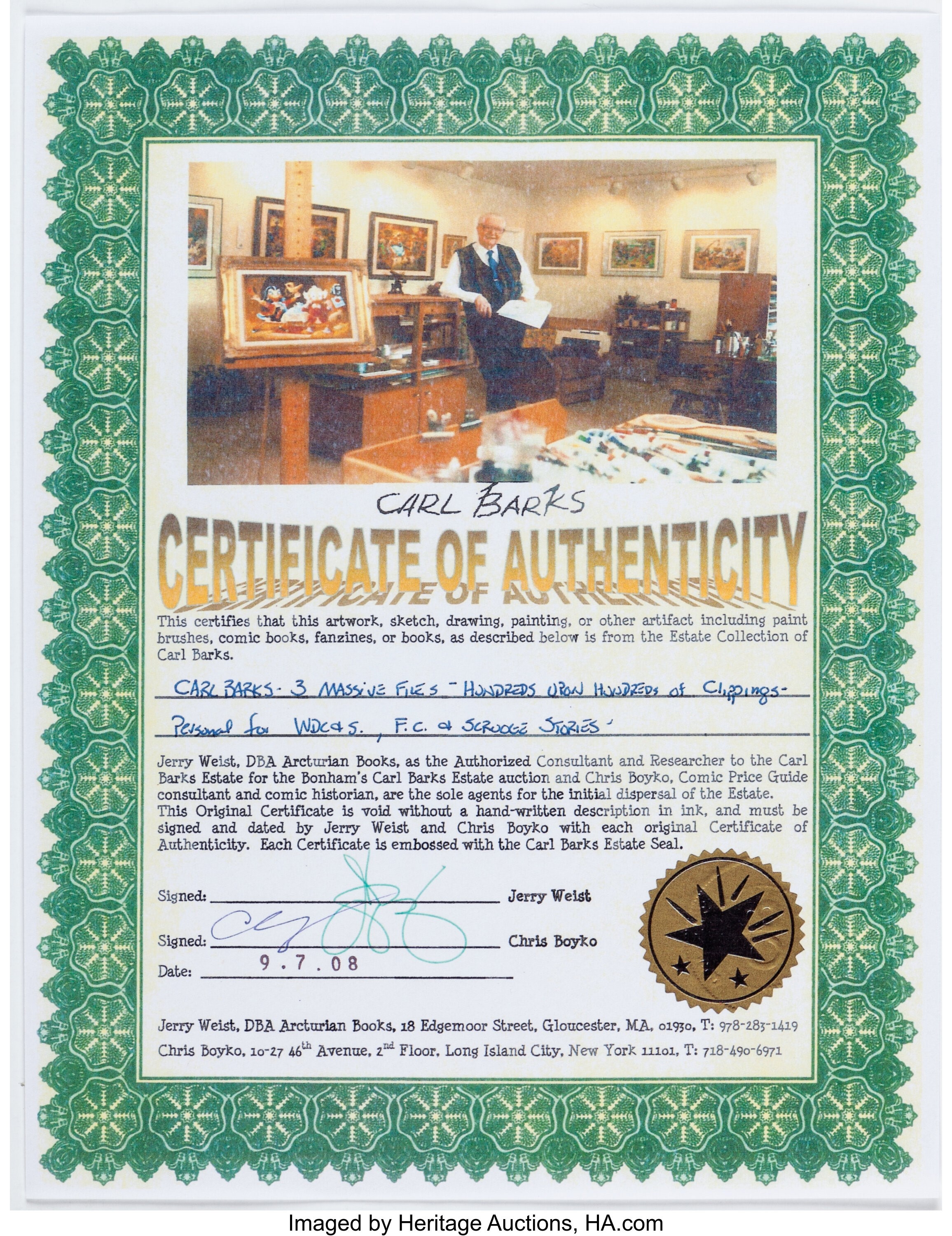 Si allega il certificato di autenticità a firma di Jerry Weist.
