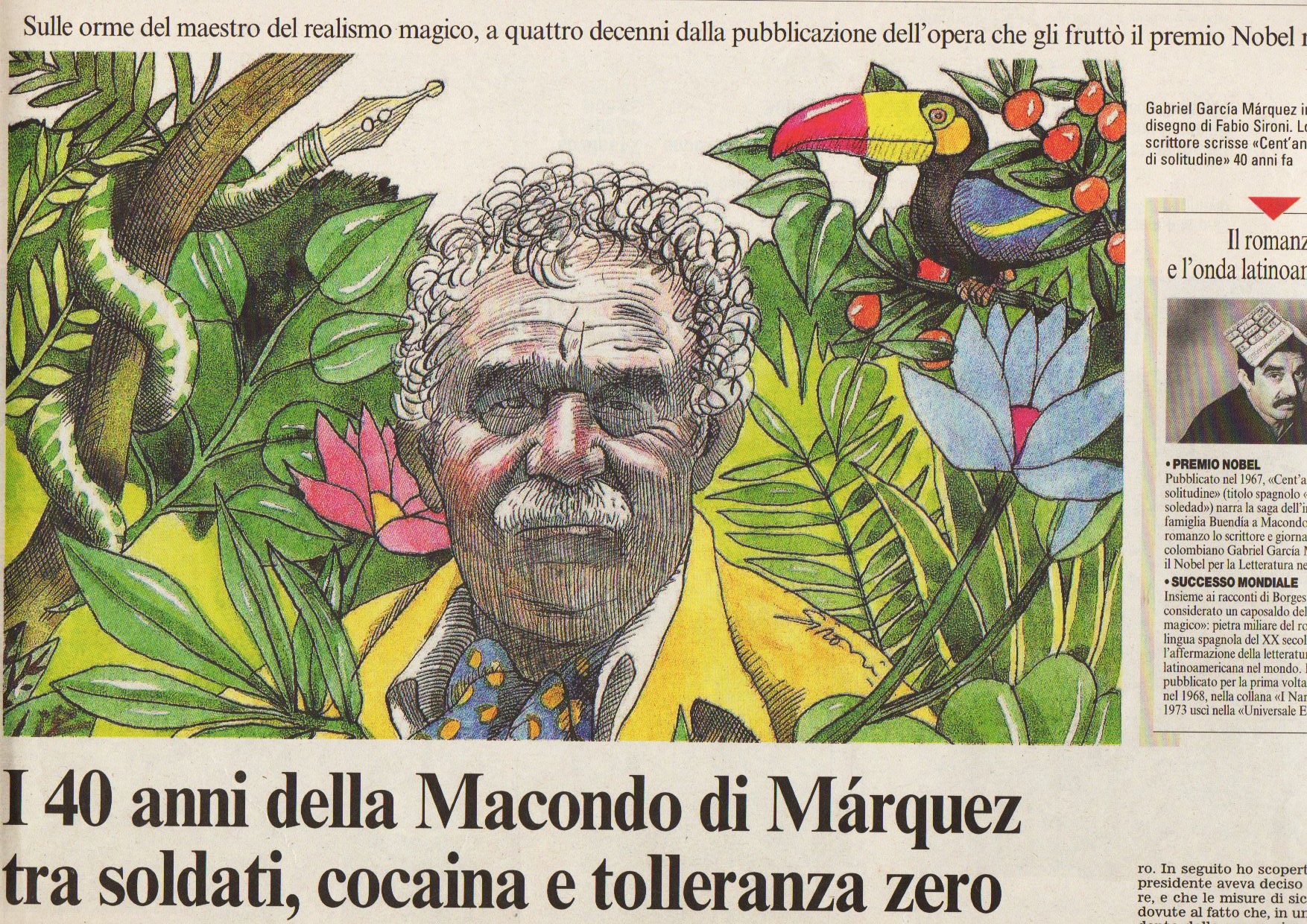 Illustrazione originale realizzata da Sironi come omaggio a Gabriel García Márquez, pubblicata sul Corriere della Sera del 4 Febbraio 2007 in occasione dei 40 dalla pubblicazione del suo "Cent'anni di solitudine". Firmata.