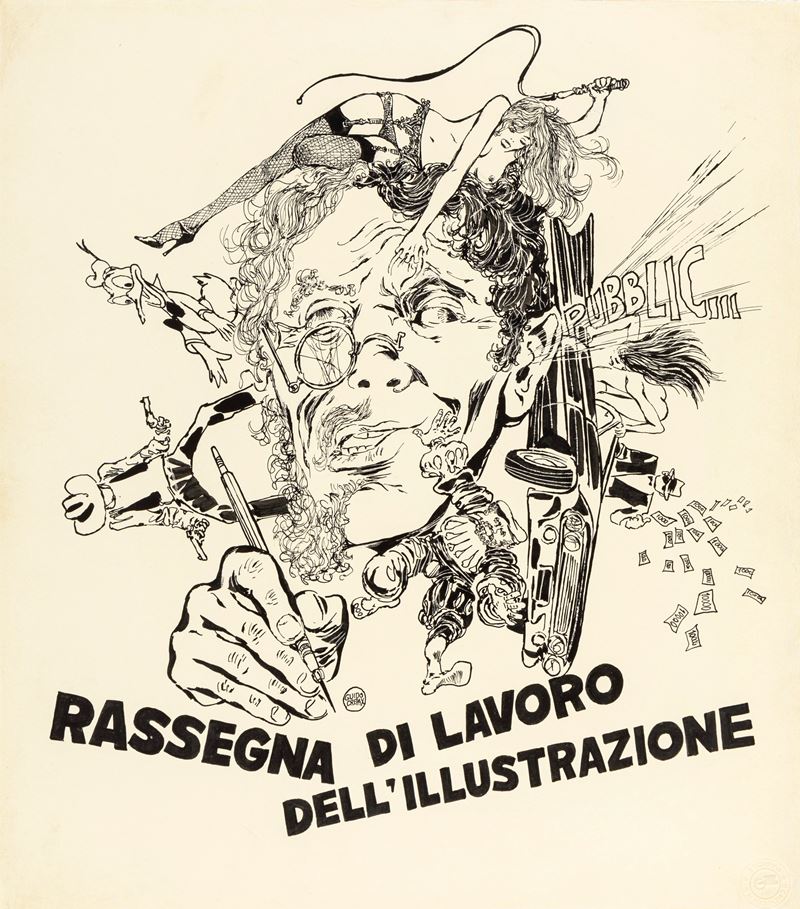 Illustrazione originale realizzata da Crepax per il manifesto della mostra "Rassegna di lavoro dell'illustrazione" tenutasi nel 1972 presso il Circolo De Amicis di Milano (oggi Fondazione Aldo Aniasi). Si trattò di una mostra di documentazione grafica sui modi e le condizioni di lavoro nel mondo dell'illustrazione e del fumetto con interventi di Pier Luciano Guardigli, Gian Carlo Ferretti e dello stesso Crepax.