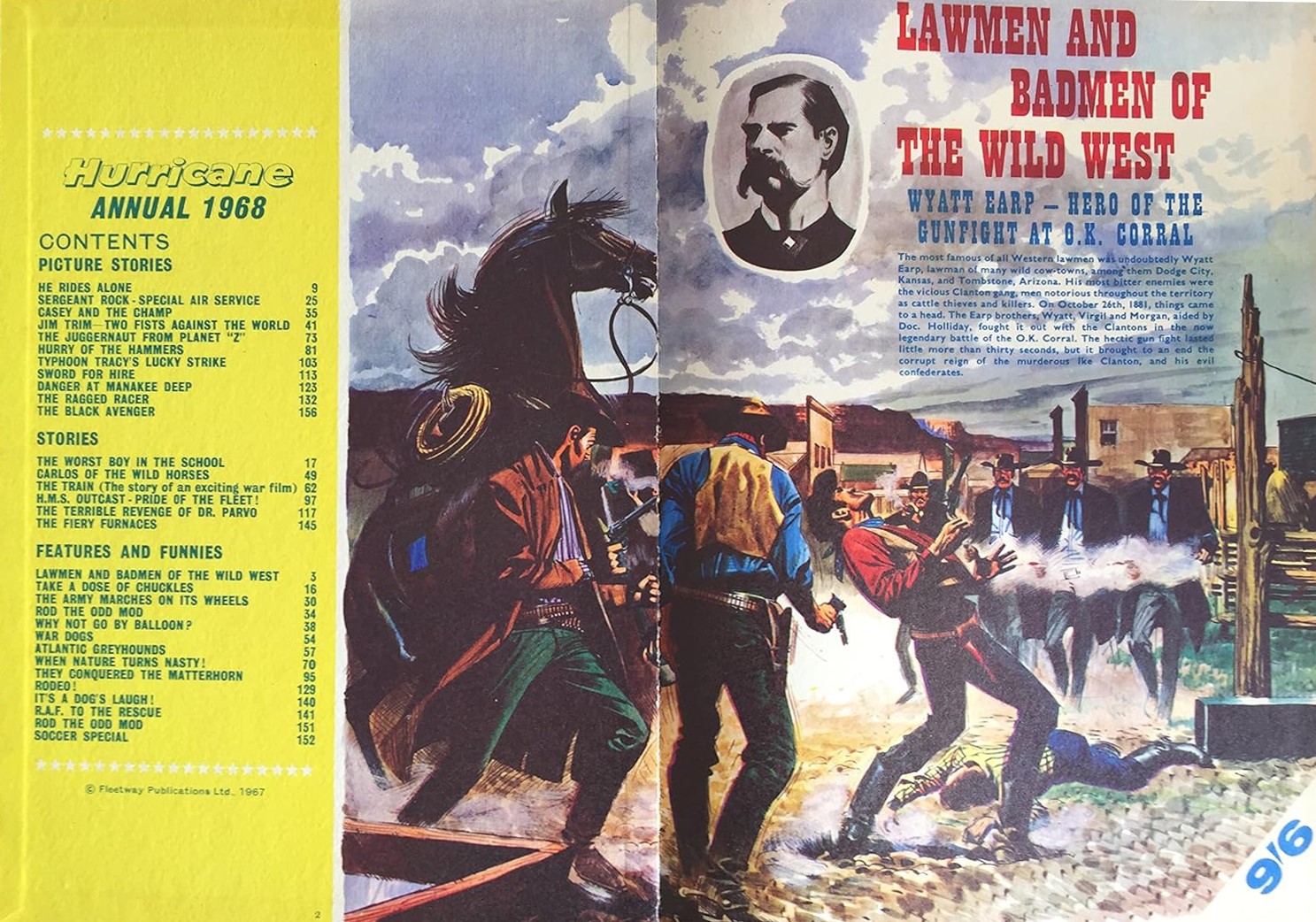 Illustrazione originale realizzata da Bishop per i risguardi di copertina del Hurricane Annual 1968, edito dalla Fleetway Publications Ltd nel 1967.