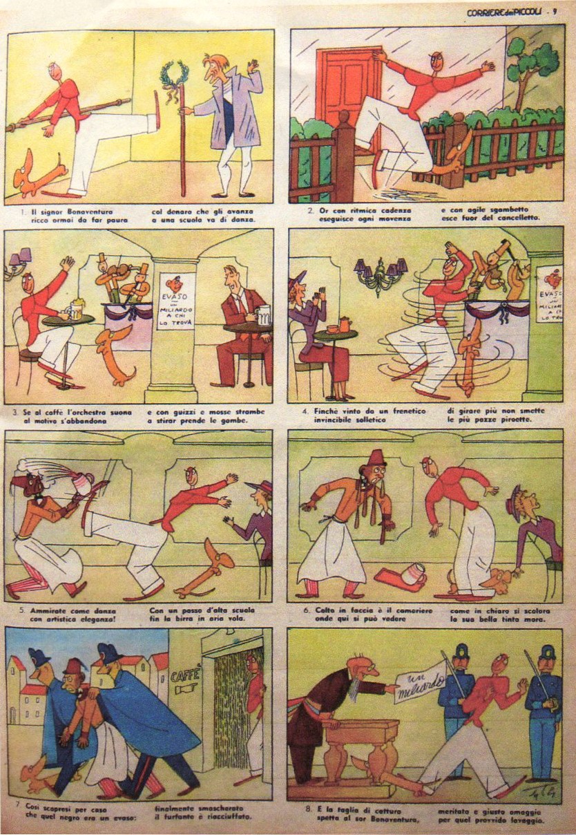 Tavola originale composta da 9 vignette realizzata da Sto per una delle fortunate avventure del Signor Bonaventura, edita sul C.d.P. n. 40 del 1954. Ideato nel 1917 e pubblicato dal CdP fino al 1978, il personaggio è entrato col suo proverbiale milione nella cultura italiana del Novecento. Nel corso degli anni la dicitura "un milione" (di lire) si aggiornò con "un miliardo", così da restare al passo coi tempi. Firmata e datata nell'ultima vignetta.
