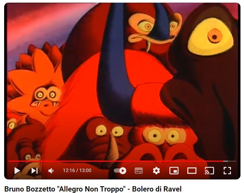 Set-up originale con cel e fondale dipinto per il "Bolero" di Maurice Ravel, il principale e più celebre episodio animato di "Allegro non troppo", film prodotto e diretto da Bruno Bozzetto nel 1976. Conosciuto anche con il nome di "La marcia dei dinosauri", il "Bolero" è l'episodio attorno al quale si è sviluppato l'intero film, il più complesso dal punto di vista tecnico (richiese due anni di lavorazione) e il più amato dallo stesso Bozzetto. Dal liquido di una Coca-Cola abbandonata da un'astronave comincia l'evoluzione della vita, partendo da un brodo primordiale le creature si evolvono e, in vero stile Darwiniano, cercano di mangiarsi a vicenda, arrivando così a uccelli, serpenti, dinosauri, scimmie e umani. La scena da noi presentata è presente al minuto 12:16. L’opera, completa di bollino di originalità della Bruno Bozzetto Film, è un raro originale esposto in una mostra in Nord America negli anni ’80.