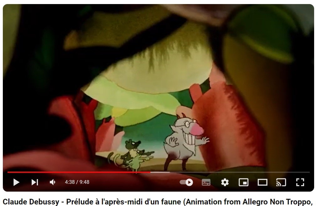 Cel originali (due fogli di acetato) su fondale riprodotto per il "Preludio al pomeriggio di un fauno" di Claude Debussy, primo episodio animato di "Allegro non troppo", film prodotto e diretto da Bruno Bozzetto nel 1976. In un mondo idilliaco, un vecchio fauno cerca compagnia femminile ma, per quanto tenti di migliorare il proprio aspetto, è rifiutato dalle giovani ninfe ed è costretto a rimanere solo senza sapere che le colline su cui cammina sono il seno di una donna. Pietra miliare dell’animazione italiana ed europea, una risposta di altissimo livello tecnico e artistico al "Fantasia" della Disney. La scena da noi presentata è presente al minuto 4:38.