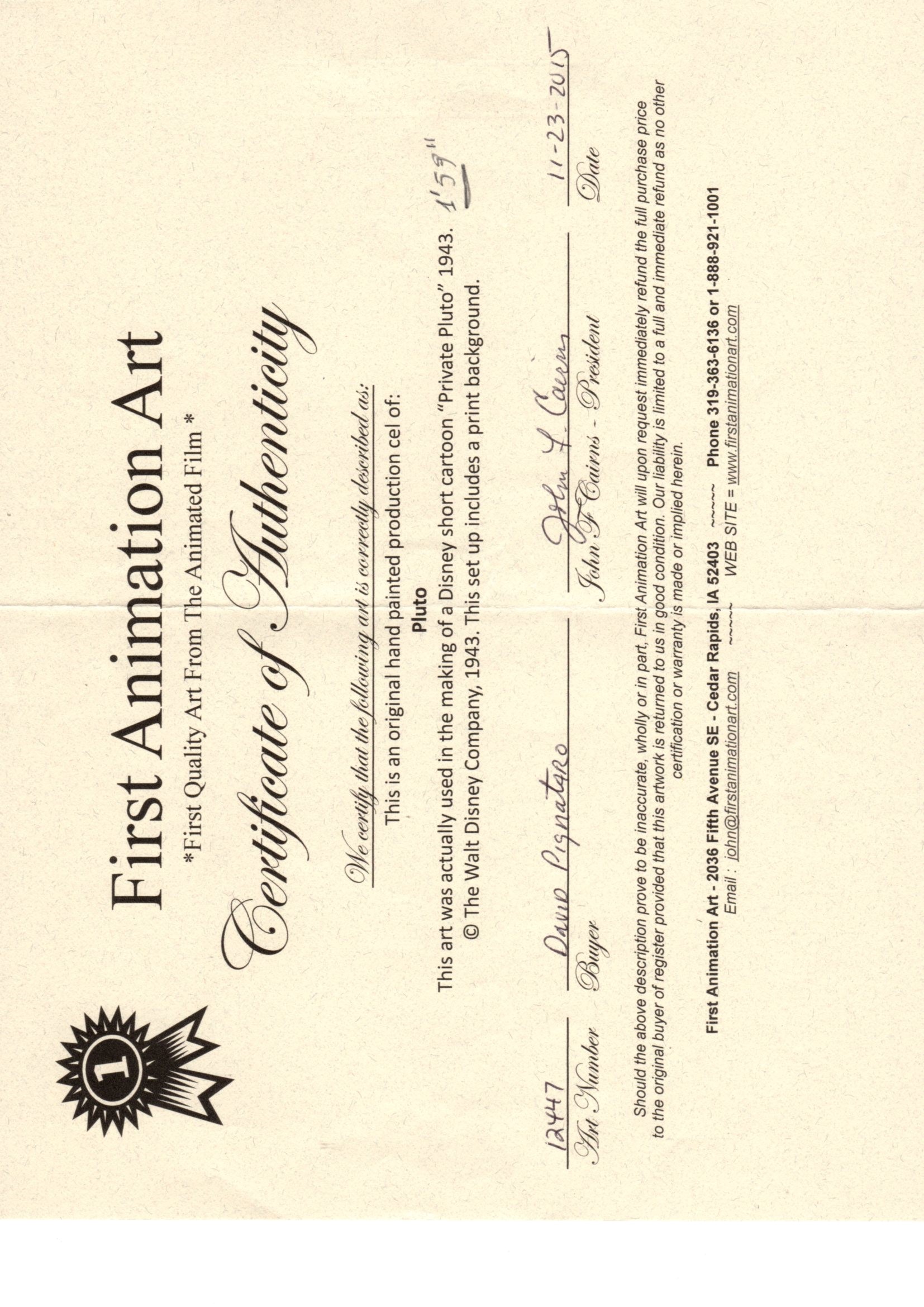 Cel originale su fondale riprodotto per il cortometraggio animato "Private Pluto", diretto da Clyde Geronimi e prodotto dalla Walt Disney Productions nel 1943. Pluto è un cane da guardia in una base militare. All'inizio cerca di seguire gli ordini di marcia, poi gli viene detto che ci sono dei sabotatori, e viene messo a guardia di un fortino. Deve così vedersela con Cip e Ciop (questo cortometraggio rappresenta la loro prima apparizione). Ondulature della cel. Si allega certificato di autenticità della galleria di provenienza.