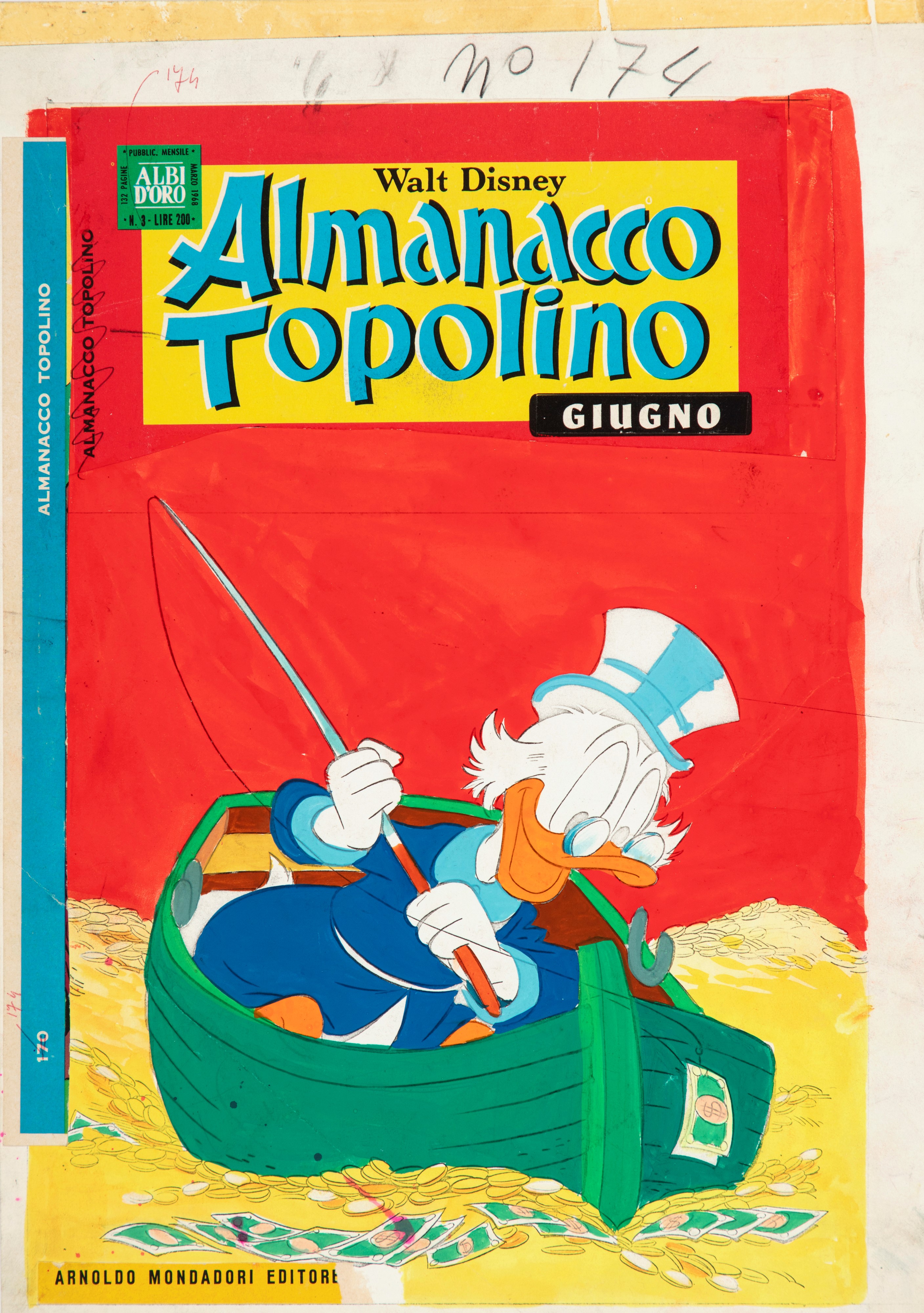 Originale di copertina realizzato da Perego per l'Almanacco Topolino n. 174 del giugno 1971. L'essenza di Zio Paperone condensata in un'unica immagine, tra le più affascinanti copertine della serie. Si allega la prova colore a tempera su carta (25 x 35 cm).