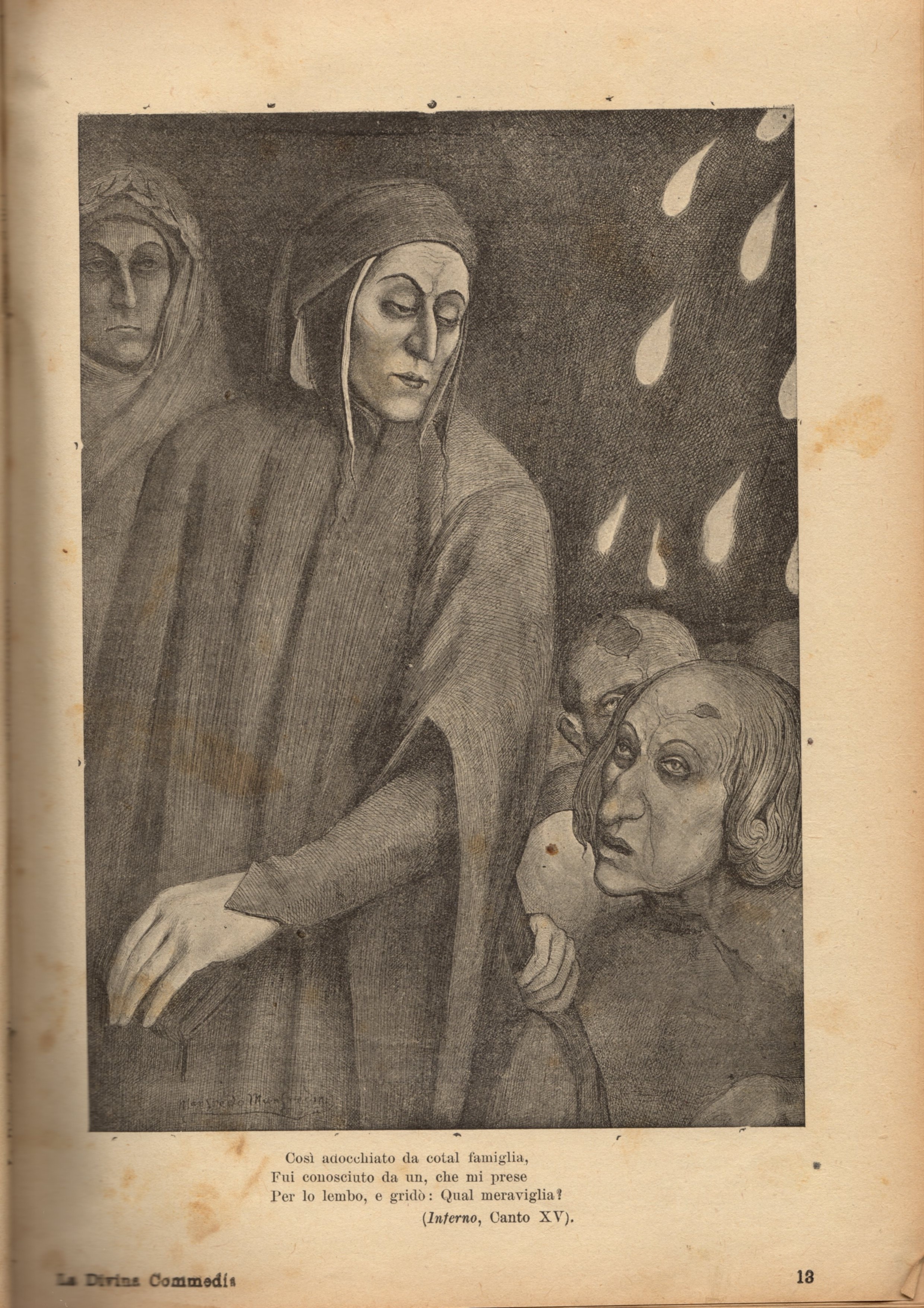 Illustrazione originale realizzata da Manfredini tra il 1904 e il 1907 per la sua celebre edizione de "La Divina Commedia" edita da Nerbini nel 1908. Fori di affissione, lievi pieghe, piccole mancanze e piccoli strappi ai margini. Firmata. Nato a Ferrara nel 1881, Manfredini si trasferì a Firenze nel 1904 anno in cui l'editore Giuseppe Nerbini gli commissionò una nuova edizione della Commedia chiedendogli di illustrare i cento canti del poema. Nel corso dell'esecuzione febbrile ed eccitata di questa faticosa opera, Manfredini si invaghì follemente della cantante lirica ucraina Solomija Krusel'nyc'ka, il suo amore non corrisposto lo portò alla follia e a diversi episodi violenti che sfociarono in numerosi arresti. Nell'aprile 1907 venne arrestato dopo essere stato trovato in possesso di una pistola e di un flacone di vetriolo (destinato probabilmente alla soprano ucraina), fu quindi ricoverato presso il manicomio di Mombello in Brianza dove, dopo un'agonia durata quaranta giorni, Manfredini morì ufficialmente per una grave forma di tubercolosi polmonare. La sua opera rimase incompiuta arrestandosi al XXX canto del Purgatorio, Nerbini decise quindi di affidare le restanti tavole al napoletano Tancredi Scarpelli.
