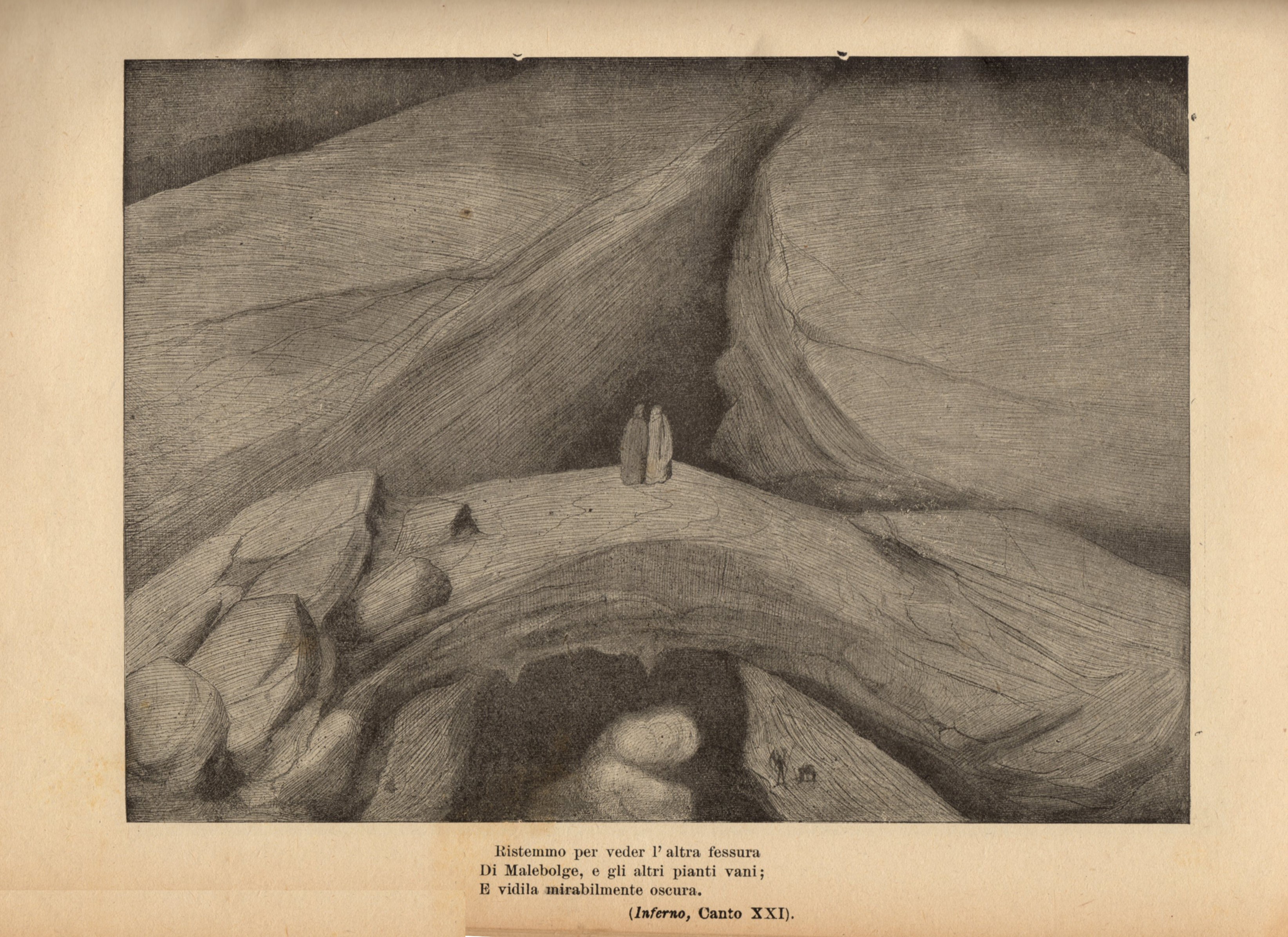 Illustrazione originale realizzata da Manfredini tra il 1904 e il 1907 per la sua celebre edizione de "La Divina Commedia" edita da Nerbini nel 1908. Lievi pieghe, piccoli strappi e piccole mancanze ai margini. Firmata. Nato a Ferrara nel 1881, Manfredini si trasferì a Firenze nel 1904 anno in cui l'editore Giuseppe Nerbini gli commissionò una nuova edizione della Commedia chiedendogli di illustrare i cento canti del poema. Nel corso dell'esecuzione febbrile ed eccitata di questa faticosa opera, Manfredini si invaghì follemente della cantante lirica ucraina Solomija Krusel'nyc'ka, il suo amore non corrisposto lo portò alla follia e a diversi episodi violenti che sfociarono in numerosi arresti. Nell'aprile 1907 venne arrestato dopo essere stato trovato in possesso di una pistola e di un flacone di vetriolo (destinato probabilmente alla soprano ucraina), fu quindi ricoverato presso il manicomio di Mombello in Brianza dove, dopo un'agonia durata quaranta giorni, Manfredini morì ufficialmente per una grave forma di tubercolosi polmonare. La sua opera rimase incompiuta arrestandosi al XXX canto del Purgatorio, Nerbini decise quindi di affidare le restanti tavole al napoletano Tancredi Scarpelli.