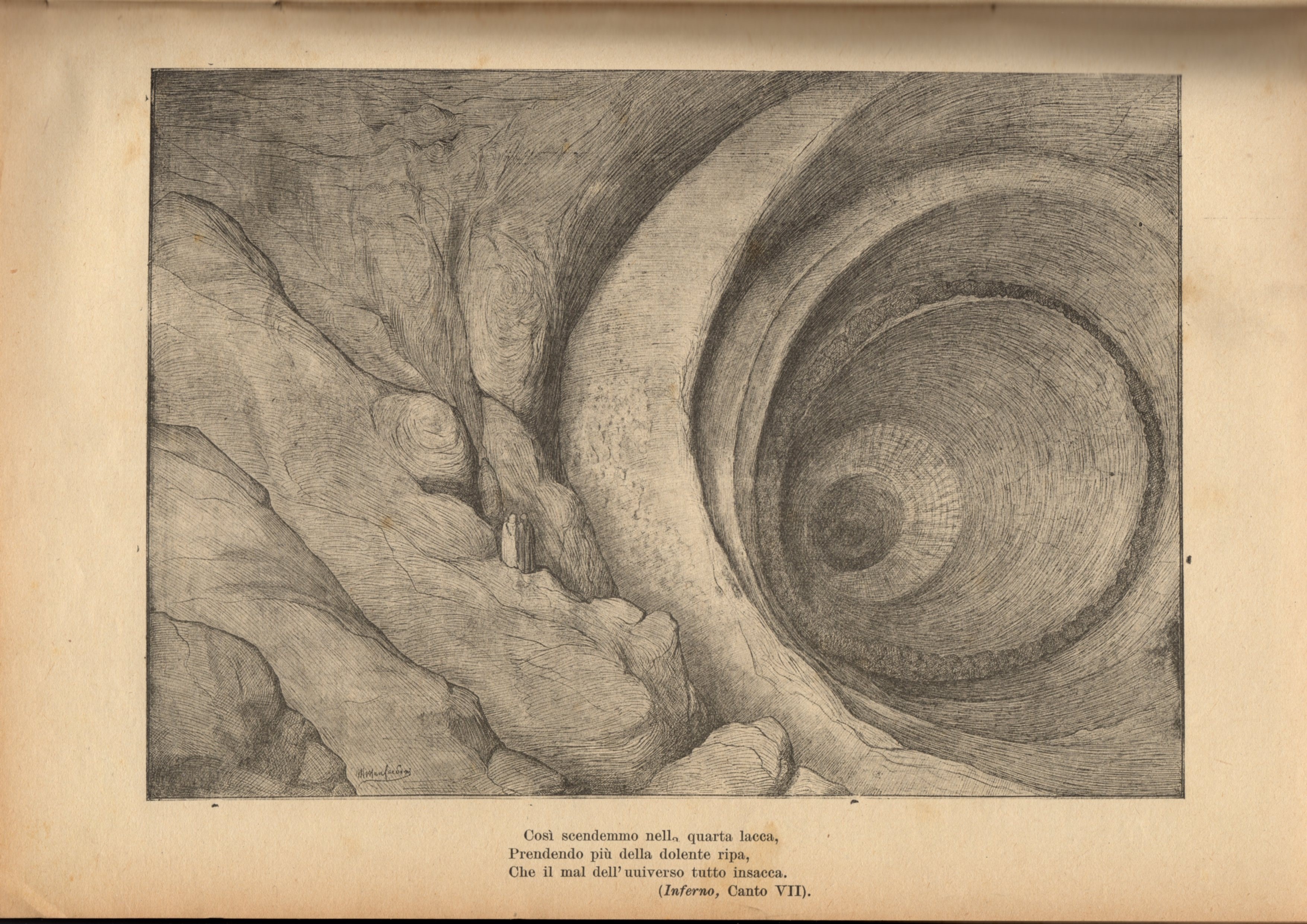 Illustrazione originale realizzata da Manfredini tra il 1904 e il 1907 per la sua celebre edizione de "La Divina Commedia" edita da Nerbini nel 1908. Fori di affissione ai margini. Firmata. Nato a Ferrara nel 1881, Manfredini si trasferì a Firenze nel 1904 anno in cui l'editore Giuseppe Nerbini gli commissionò una nuova edizione della Commedia chiedendogli di illustrare i cento canti del poema. Nel corso dell'esecuzione febbrile ed eccitata di questa faticosa opera, Manfredini si invaghì follemente della cantante lirica ucraina Solomija Krusel'nyc'ka, il suo amore non corrisposto lo portò alla follia e a diversi episodi violenti che sfociarono in numerosi arresti. Nell'aprile 1907 venne arrestato dopo essere stato trovato in possesso di una pistola e di un flacone di vetriolo (destinato probabilmente alla soprano ucraina), fu quindi ricoverato presso il manicomio di Mombello in Brianza dove, dopo un'agonia durata quaranta giorni, Manfredini morì ufficialmente per una grave forma di tubercolosi polmonare. La sua opera rimase incompiuta arrestandosi al XXX canto del Purgatorio, Nerbini decise quindi di affidare le restanti tavole al napoletano Tancredi Scarpelli.