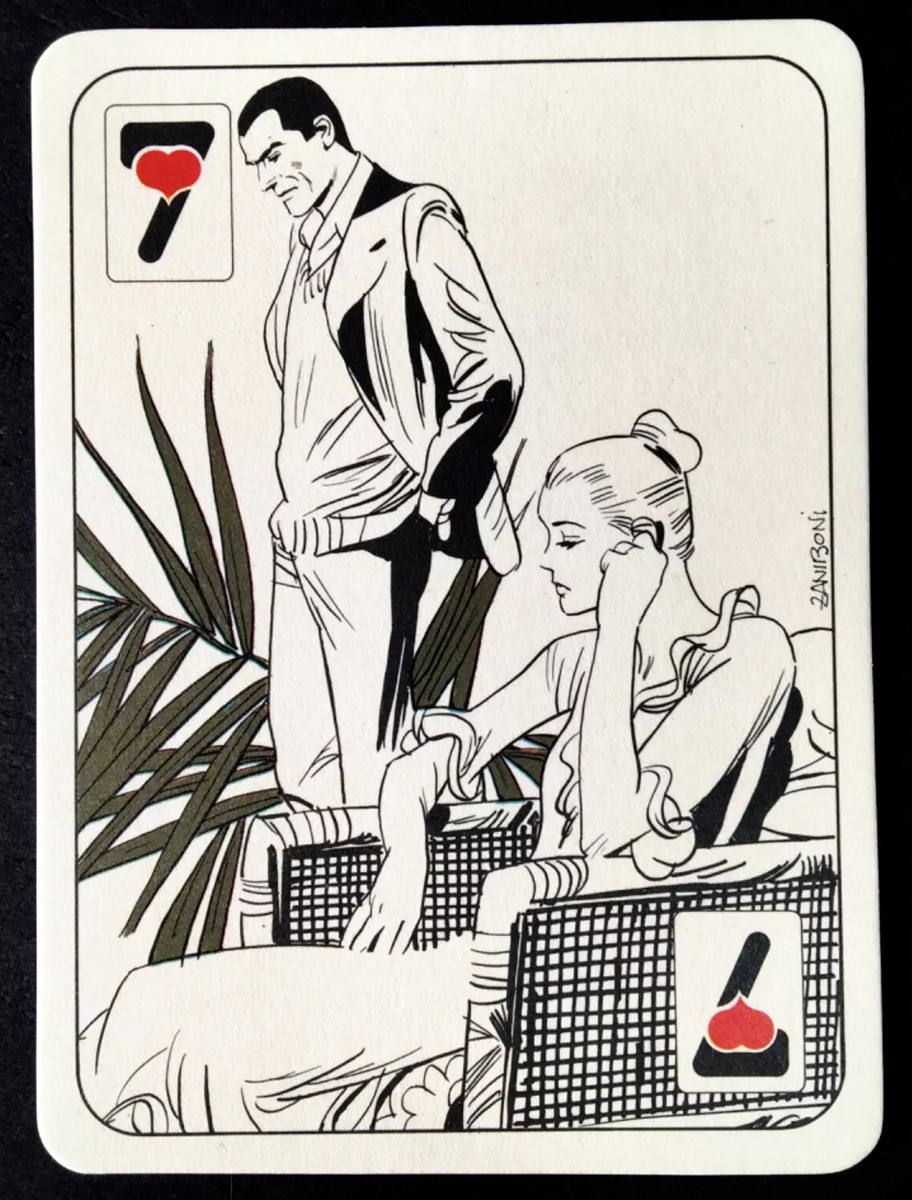 Illustrazione originale realizzata da Zaniboni per la carta del 7 di Cuori contenuta nel mazzo da gioco Le Nuvole Parlanti edito nel 1980. Leggendario mazzo da gioco a cui parteciparono 120 autori tra i più celebri dell‘epoca. Firmata.
