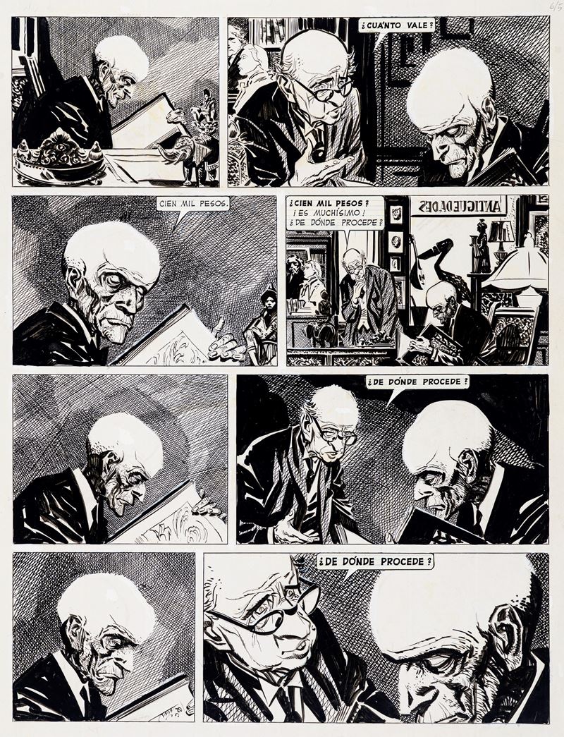 Tavola originale realizzata da Breccia per "El idolo", pag. 5 del secondo episodio di Sherlock Time edito per la prima volta sulle pagine della rivista argentina Hora Cero Extra n. 6 nel 1959, edito in Italia con il titolo "La statuetta" su Lanciostory nel 1978. Per la prima volta in coppia con Oesterheld, Breccia realizza con Sherlock Time il primo grande balzo di stile della sua prolifica carriera. Il vecchietto collezionista di antichità Eustachio Mendez è il protagonista di questa storia in bilico tra fantascienza e mistery, ed è a lui che Breccia decide di affidare le sue sembianze, le stesse che soli quattro anni dopo affiderà al vecchio antiquario Ezra Winston con "Mort Cinder". Il personaggio di Ezra nasce proprio su queste pagine, sotto falso nome, ma con il suo inconfondibile volto, quello del suo geniale creatore. Un pezzo da museo.