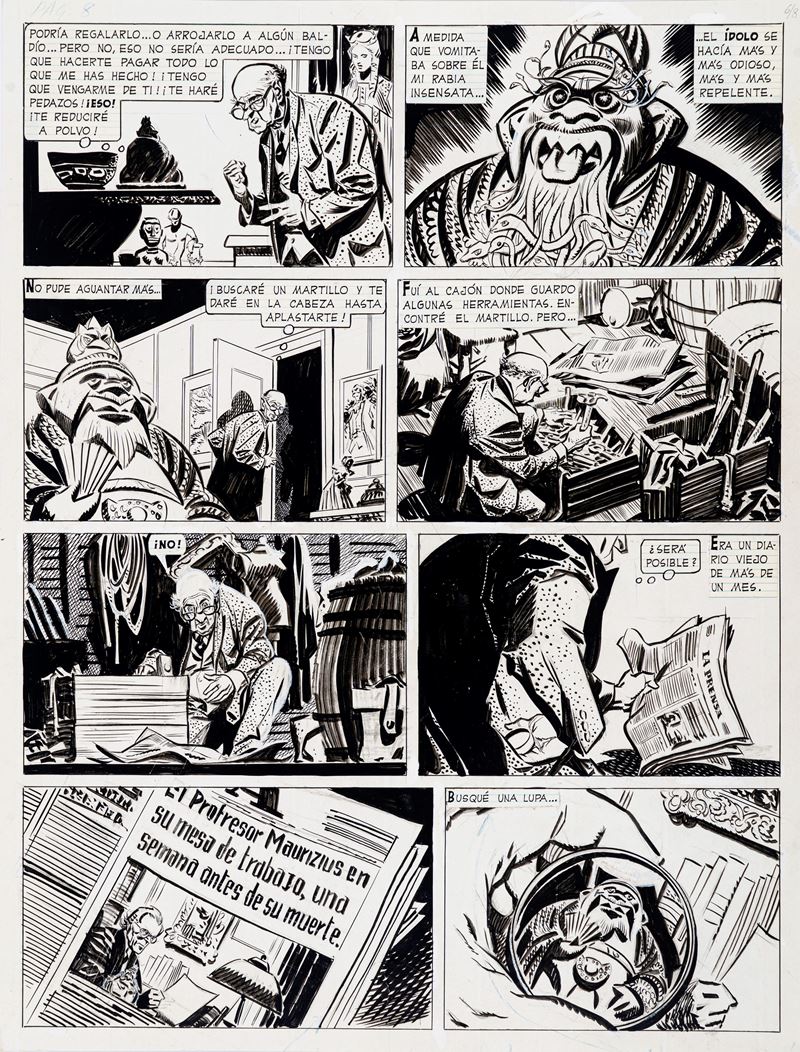 Tavola originale realizzata da Breccia per "El idolo", pag. 8 del secondo episodio di Sherlock Time edito per la prima volta sulle pagine della rivista argentina Hora Cero Extra n. 6 nel 1959, edito in Italia con il titolo "La statuetta" su Lanciostory nel 1978. Per la prima volta in coppia con Oesterheld, Breccia realizza con Sherlock Time il primo grande balzo di stile della sua prolifica carriera. Il vecchietto collezionista di antichità Eustachio Mendez è il protagonista di questa storia in bilico tra fantascienza e mistery, ed è a lui che Breccia decide di affidare le sue sembianze, le stesse che soli quattro anni dopo affiderà al vecchio antiquario Ezra Winston con "Mort Cinder". Il personaggio di Ezra nasce proprio su queste pagine, sotto falso nome, ma con il suo inconfondibile volto, quello del suo geniale creatore. Un pezzo da museo.