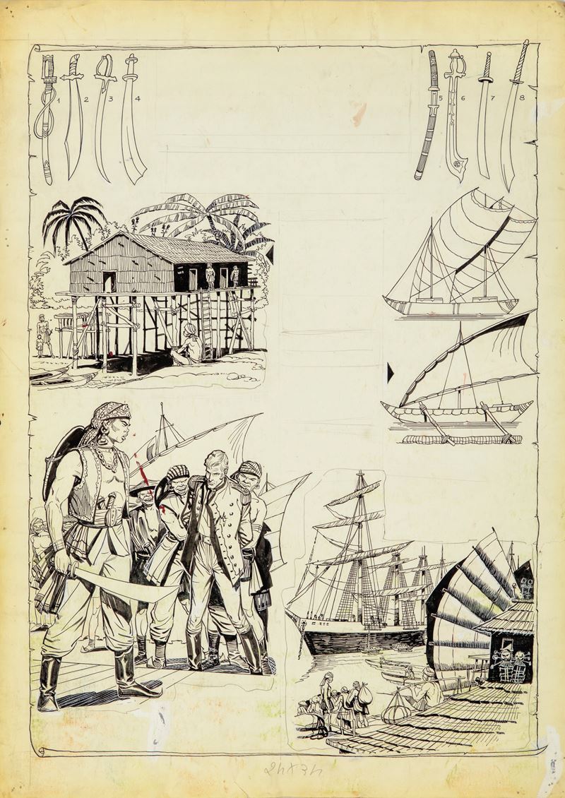 Tavola originale realizzata da Monasterolo durante gli anni '50. Fori di affissione, pieghe e piccoli strappi ai margini. Colorata a tempera al retro.