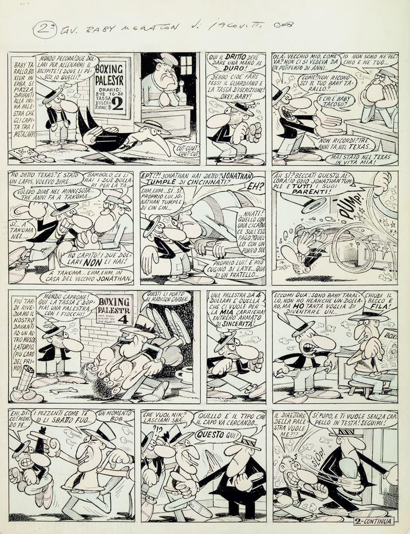 Tavola originale realizzata da Jacovitti per "Baby Megaton", pag. 2 del quarto episodio pubblicato per la prima volta sulle pagine de Il Giorno nel 1962. Fori di affissione al margine superiore. Acquerellata al retro. Firmata e datata con lisca di pesce.