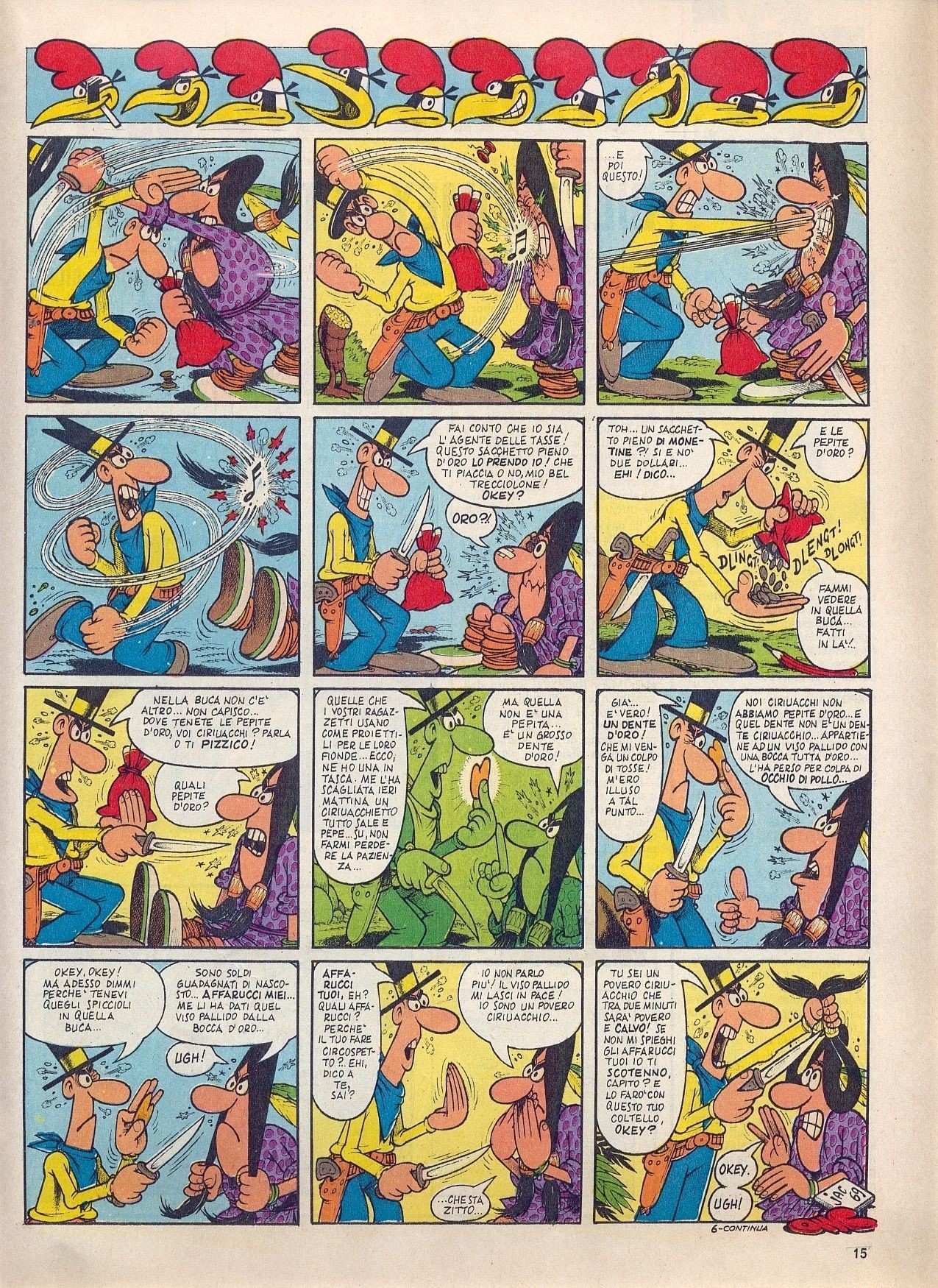 Tavola originale realizzata da Jacovitti per la ventiquattresima avventura di Cocco Bill intitolata "Occhio di Pollo e... i polli con l‘occhio", pag. 23 edita per la prima volta nel 1969. Acquerellata al retro. Firmata e datata con lisca di pesce.