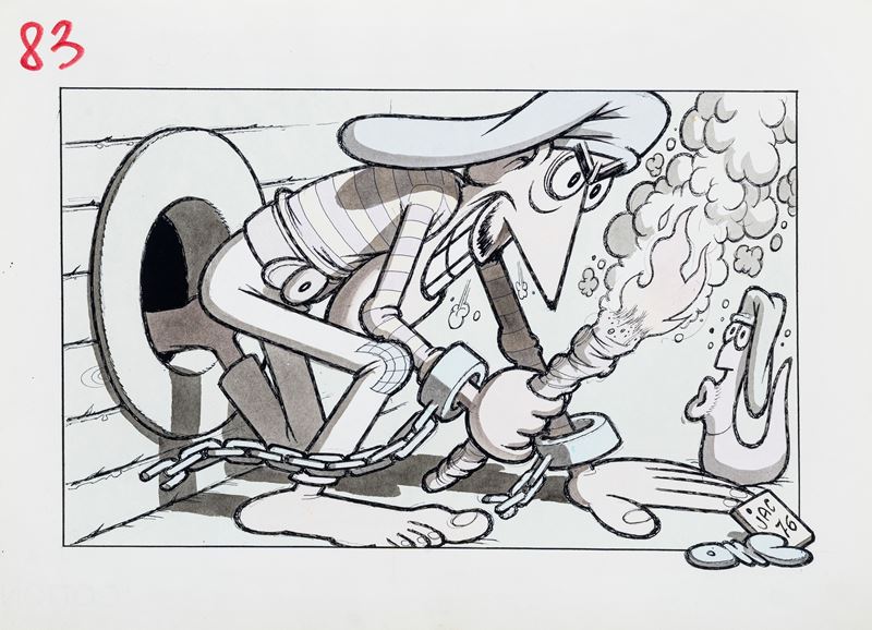Illustrazione originale n. 83 realizzata da Jacovitti per i romanzi di Emilio Salgari nel 1976, rimasta inedita fino al 1997 quando venne pubblicata all‘interno del volume "Il Salgarone" dalle edizioni Jacovitti Club. Acquerellata al retro. Firmata e datata con lisca di pesce.