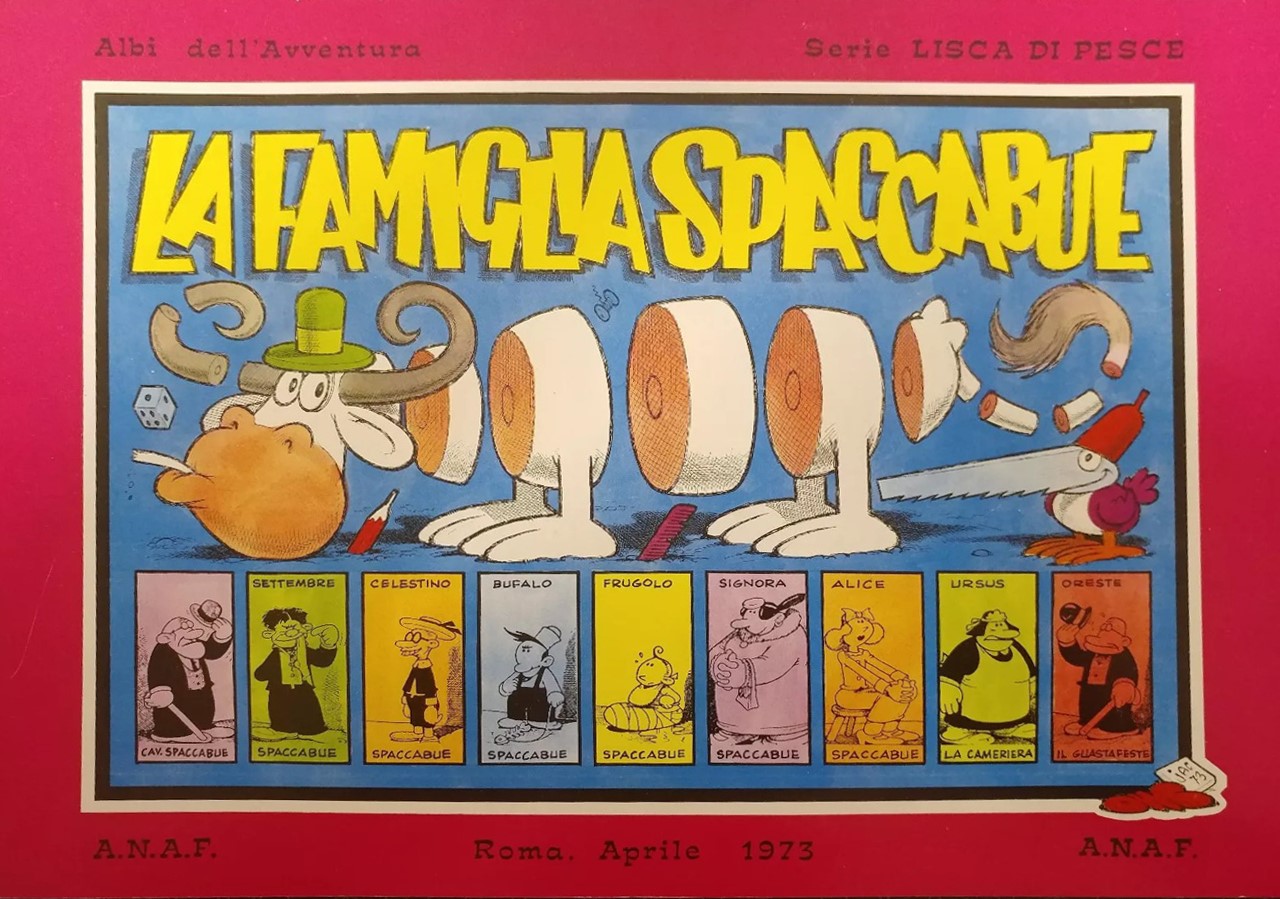 Originale di copertina realizzato da Jacovitti per il volume "La Famiglia Spaccabue" edito nella Collana Lisca di Pesce n. 10 (Albi dell'Avventura) edito da ANAF nel 1973. I personaggi nei riquadri inferiori sono in fotocopia. Acquerellato al retro. Firmato con lisca di pese e datato.