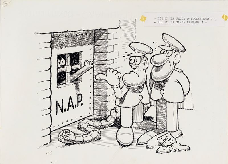 Illustrazione originale realizzata da Jacovitti nel 1975. Piccolo strappo all'angolo superiore sinistro. Firmata con lisca di pesce e datata.