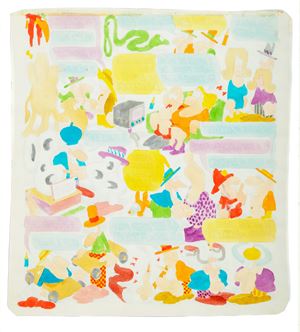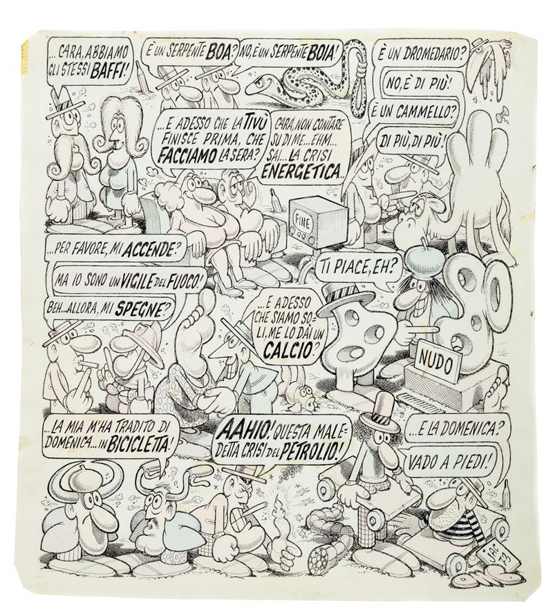 Illustrazione originale realizzata da Jacovitti e pubblicata sul quotidiano milanese Il Giorno nel 1973. Jacovitti è famoso per le sue illustrazioni panoramiche piene di personaggi grotteschi e irriverenti, che caratterizzano anche questa tavola costellata di ossa, matite e salami. Acquerellata al retro. Firmata con lisca di pese e datata.