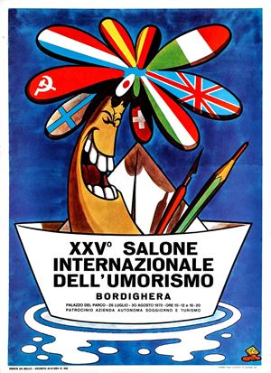 Illustrazione originale di grande formato realizzata da Jacovitti per il manifesto ufficiale del XXV Salone Internazionale dell'Umorismo tenutosi a Bordighera nel Luglio e Agosto del 1972. Firmata e datata con lisca di pesce.