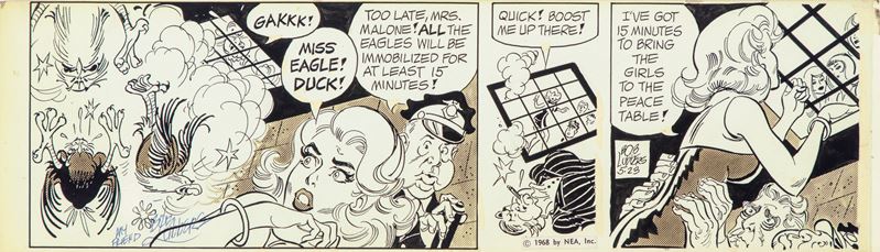 Striscia giornaliera del 23/05/1968 per "Robin Malone". Piega verticale al centro. Firmata, datata e dedicata.