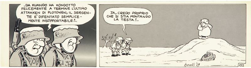 Striscia originale n. 152 realizzata da Bonvi per la serie regolare delle "Sturmtruppen" nel 1969. Una delle rarissime strisce delle Sturm nella sua prima versione, pubblicata per la prima volta sui quotidiani Paese Sera e L'Ora di Palermo e successivamente sul volume "Sturmtruppen" edito dalla casa editrice bolognese New Time nel 1970. Come molti sanno la storia delle prime strisce originali delle Sturmtruppen è alquanto travagliata, molte andarono perdute dallo stesso Bonvi e altre risultarono danneggiate dall'uso di colle retiniche e pennarelli che con il tempo si rivelarono inadeguati, così per le ristampe successive molte strisce furono ridisegnate dai collaboratori di Bonvi (Silver o Clod), solo quelle recanti la firma di Bonvi sono da considerarsi la prima versione e quindi le uniche realmente disegnate da Bonvi. Il maestro bolognese decise di preservare questa striscia applicandovi sopra una pellicola trasparente, così facendo effettivamente il tempo non ha scalfito la bellezza di questo capolavoro. Di grande rarità. Firmata e datata.