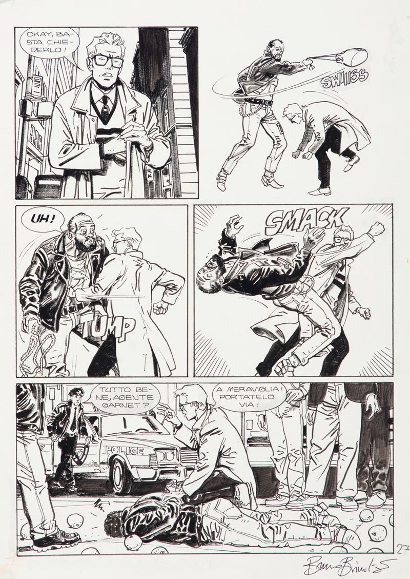 Tavola originale realizzata da Brindisi per "La lunga ombra", edita su Nick Raider n. 61 a pag. 27 dalla Bonelli nel 1993. Lieve piega all'angolo inferiore destro. Firmata.
