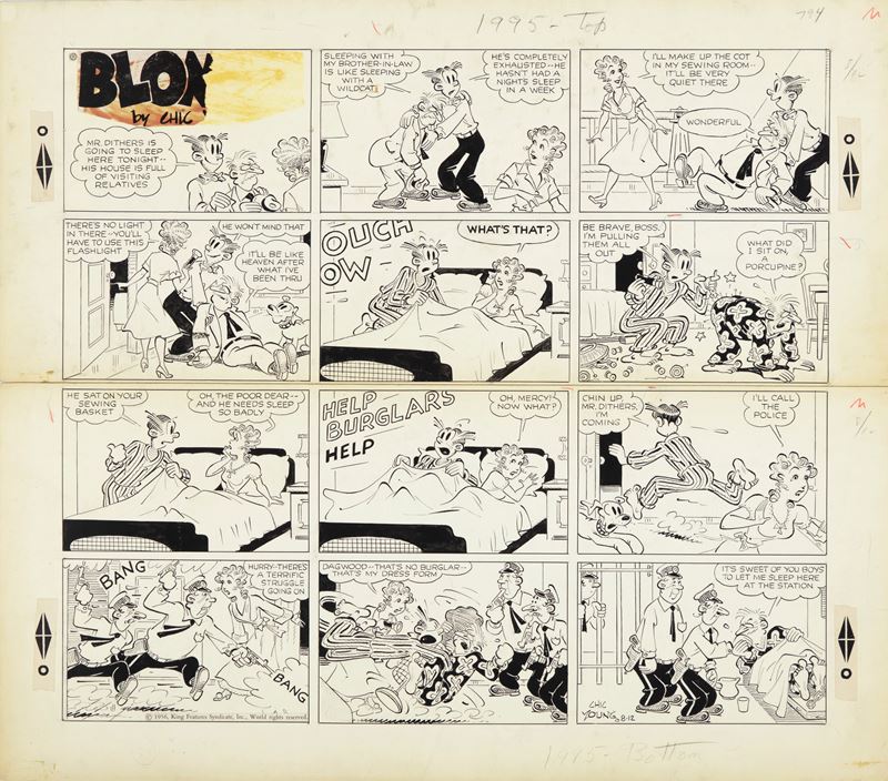 Tavola domenicale del 12/08/1956 per "Blondie". Prototipo delle moderne sit-com, questa striscia, nata dal genio di Young nel 1930, vede protagonista la tradizionale famiglia americana dei Bumstead. Su due pannelli. Firmata e datata.