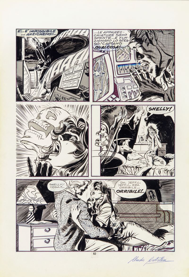 Tavola originale realizzata da Castellini per "La casa infestata", edita su Dylan Dog n. 30 a pag. 62 dalla Bonelli nel 1989. Una pagina storica per ogni dylandogofilo che si rispetti, Castellini che debuttò ufficialmente nel mondo del fumetto proprio con questo numero, dimostrando fin da subito una maestria degna della sua futura fama. Firmata.