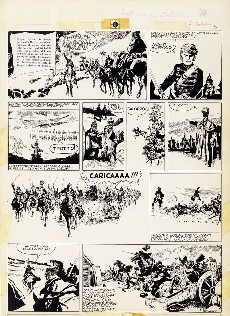 Tavola originale realizzata da Battaglia per la pag. 25 de "Il piccolo Re", storia edita per la prima volta nel 1961 sui testi di Mario Faustinelli. Acquerellato al retro. Fori di affissione e lieve piega all'angolo superiore sinistro, piccolo taglio editoriale al margine superiore.