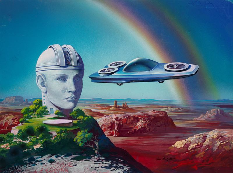 Illustrazione originale realizzata da Busett per la Grande Enciclopedia della Fantascienza, edita dall‘Editoriale Del Drago nel 1980-81. Al retro: << Arizona - Valle dei monumenti - Osservatorio in stile anatomico con macchina volante. >> Lieve piega all'angolo superiore sinistro. Firmato.