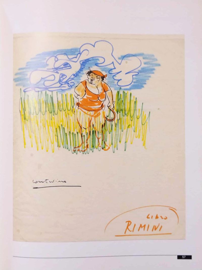 Disegno originale realizzato da Fellini nei primi anni ‘70 raffigurante una contadina durante la mietitura del grano, una delle tante "baffone", il soprannome delle contadine che i ragazzotti in "Amarcord" vanno a spiare con sguardi peccaminosi. Opera pubblicata a piena pagina nel volume "Federico Fellini: La mia Rimini" a pag. 57 da Guaraldi Editore nel 2003. L'espressione più immediata della straordinaria fantasia di Federico Fellini è sempre stata il disegno, sia durante la preparazione dei film, sia in quei momenti più intimi, spensierati e quindi gioiosi in cui, scaricatosi di tutte le energie creative, si tuffava in quelle più distensive e liberatorie che gli suggeriva il disegno. Piega orizzontale al margine superiore, lievi pieghe e piccoli strappi ai margini, piccola mancanza all'angolo inferiore sinitro.