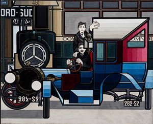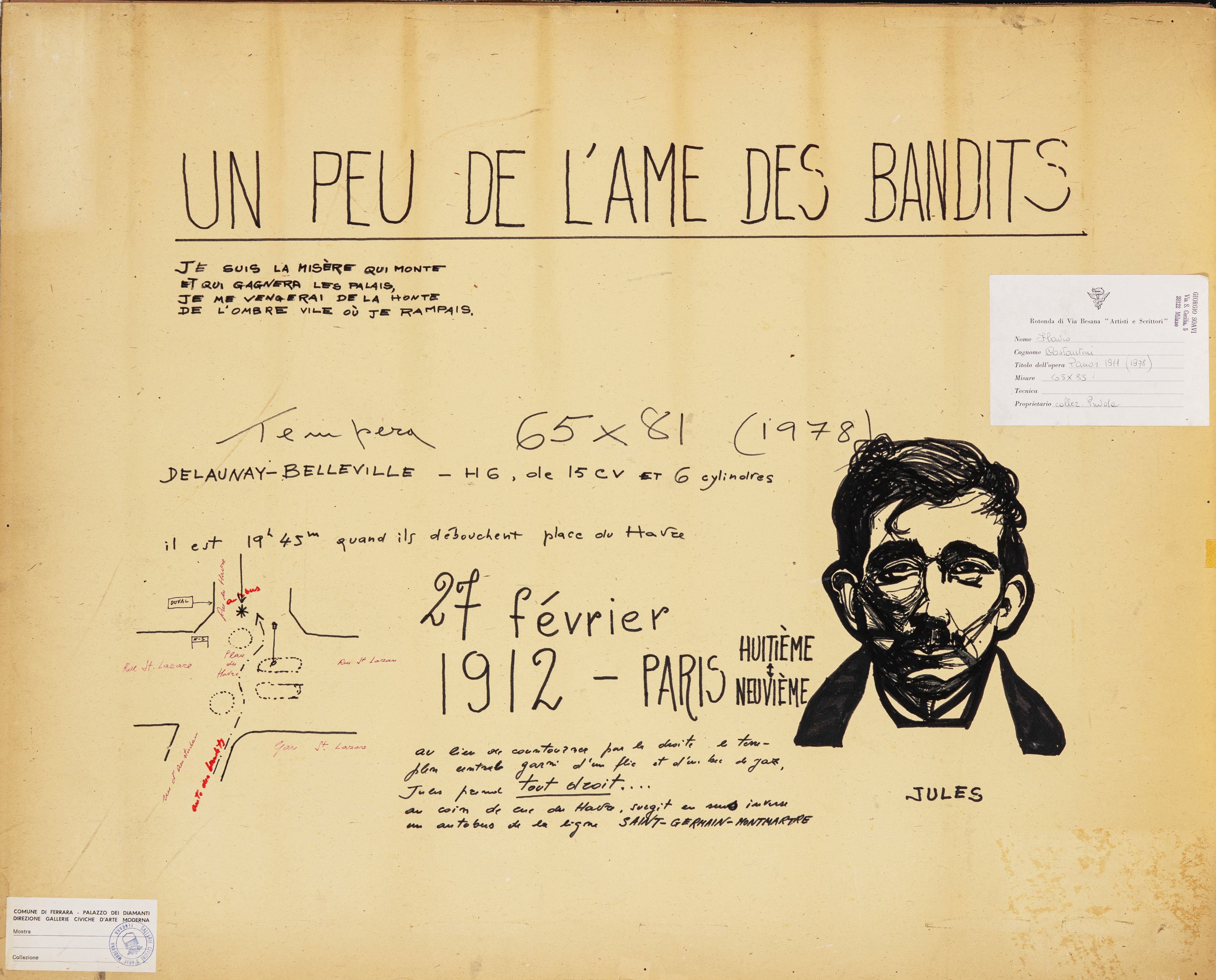 Dipinto originale realizzato da Costantini nel 1978 intitolato "Un peu de l'ame des bandits", ispirato alla Banda Bonnot capitanata dall'anarchico e fuorilegge francese Jules Bonnot (qui raffigurato al volante dell'auto a fianco del giovane Octave Garnier). Opera di valenza museale pubblicata innumerevoli volte: nel saggio "Il sogno continua" di Giorgio Soavi a pag. 229 dalla Rizzoli nel 1982, nel saggio "Flavio Costantini: L'anarchia, molto cordialmente" di Roberto Farina a pag. 208 da Milieu nel 2016, nel catalogo della mostra "Costantini: La luce nel silenzio" a pag. 54 da Electa nel 2000, come copertina nel catalogo della mostra "L'illustrazione racconta: la collezione Cereda" dalla Fondazione Peano nel 2022. Titolato al retro, con disegno e indicazioni dell'autore. Firmato e datato.