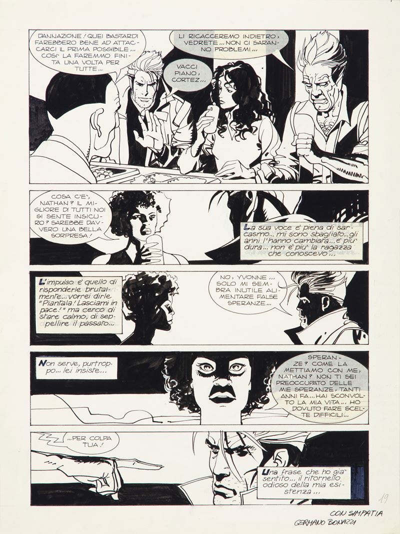 Tavola originale realizzata da Bonazzi per "La prigioniera del castello", edita su Nathan Never n. 24 a pag. 19 dalla Bonelli 1993. Firmata e dedicata.