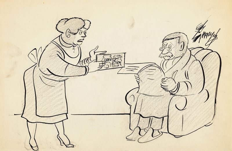 Illustrazione originale realizzata da Guareschi e pubblicata sulle pagine del quotidiano La Notte il 20 dicembre 1963. << Se la legge punisce i fabbricatori di biglietti falsificati, perché non punisce chi stampa questi biglietti da mille che, dopo un mese, non valgono neppure novecento lire? >> Firmata al fronte e datata al retro.