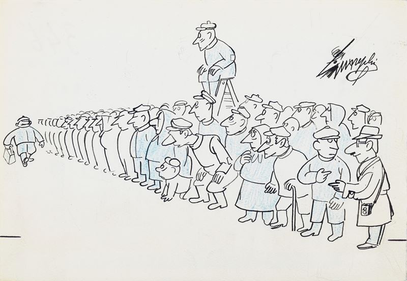 Illustrazione originale realizzata da Guareschi e pubblicata sulle pagine del quotidiano La Notte il 14 ottobre 1964. << Chi è? Uno dei tre astronauti del Voskod? / No, è il compagno Cikof, in sole sette ore di coda, è riuscito a conquistare due chili di patate, tre carote, un etto di lardo e 75 grammi dii burro. >> Firmata al fronte e datata al retro.