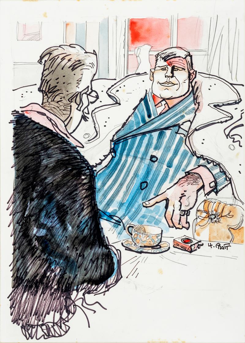 Illustrazione originale realizzata da Pratt per la prima parte del racconto breve "Il Matrimonio", edito sul quotidiano La Nuova Venezia il 20/07/1986 e ripubblicato negli stessi giorni su altri quotidiani del Gruppo Espresso: Mattino di Padova e Tribuna di Treviso. Il presente acquerello fu realizzato da Pratt a corredo di un racconto breve scritto dall'amico dei tempi argentini Alberto Ongaro. Rarissimo caso in cui il maestro di Malamocco decise di prestare il suo volto ad un suo personaggio, realizzando così un vero e proprio autoritratto, indossando oltretutto un cappotto che ci riporta alla memoria le avventure del suo Corto Maltese. Piccole tracce di foxing ai margini. Firmata.