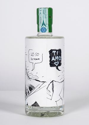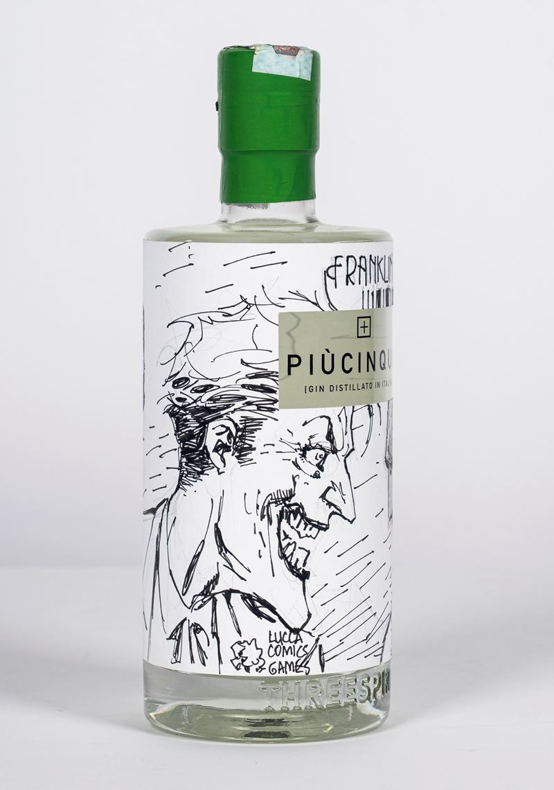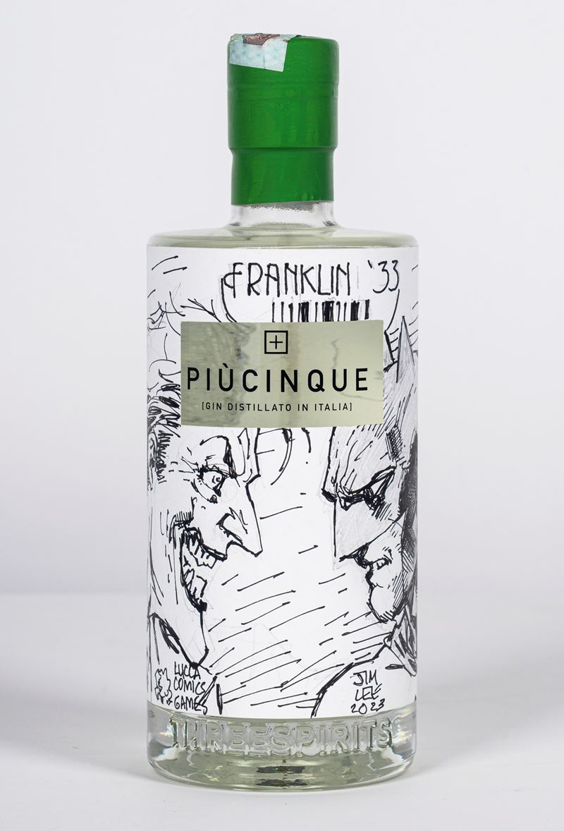 Disegno originale realizzato da Lee durante la convention di Lucca Comics and Games del 2023, l'opera è stata applicata su una bottiglia di gin Piùcinque, ancora sigillata. Firmata e datata.