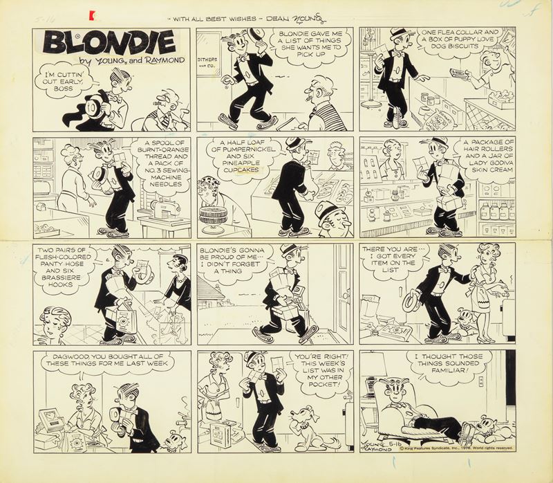 Tavola domenicale del 16/05/1976 per "Blondie". Su due pannelli. Firmata, datata e dedicata.