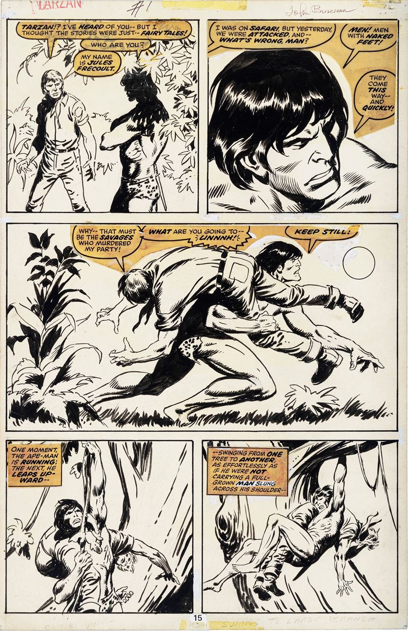 Tavola originale realizzata da Buscema (matite e chine) per "Tarzan and the Jewels of Opar", edita su Tarzan n. 1 a pag. 15 dalla Marvel nel 1977. Una pagina perfetta dal primo storico numero di Tarzan, un pezzo da museo. Firmata.