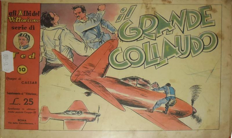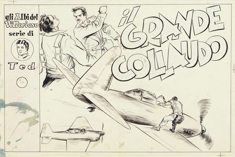 Originale di copertina realizzato da Caesar per "Il grande collaudo", edito nella collana Serie di Ted n. 10 negli Albi del Vittorioso dalle Edizioni AVE nel 1949. Colorata al retro ad acquerello. Piega verticale al centro, lievi pieghe agli angoli, piccoli strappi ai margini.