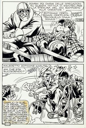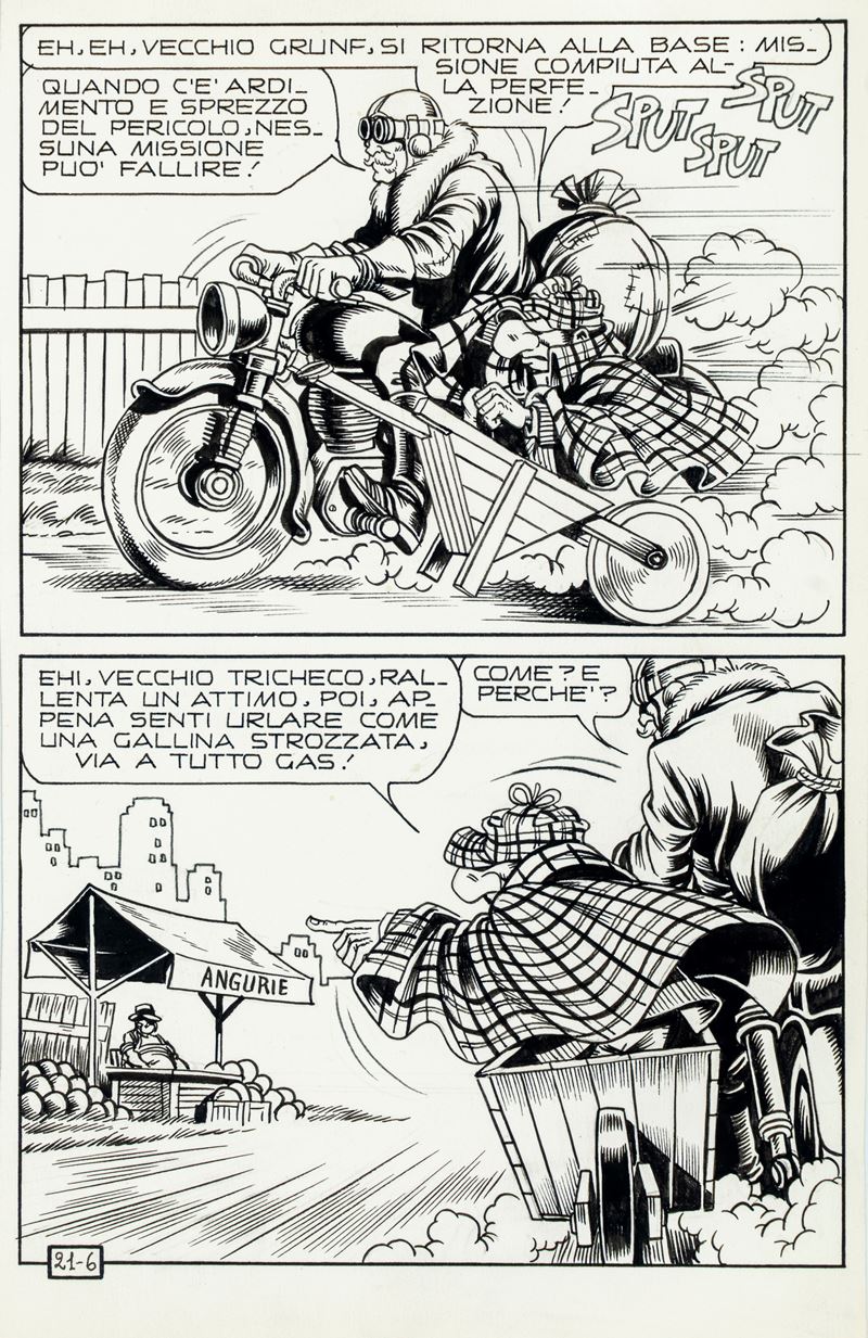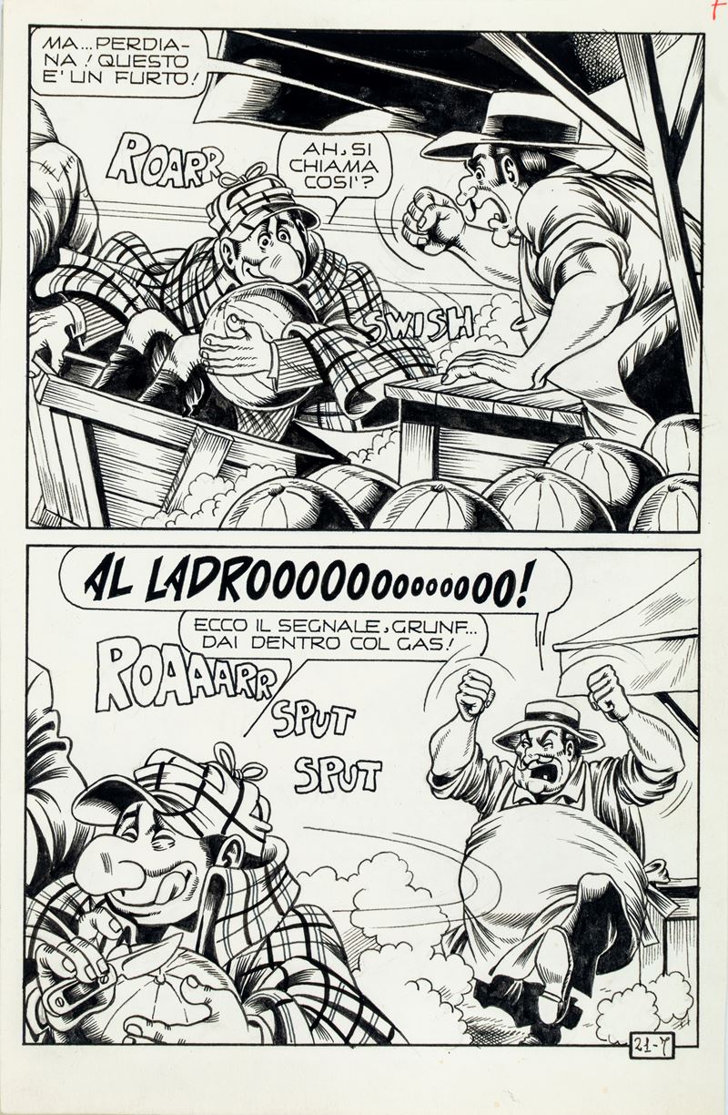 Lotto composto da 3 tavole originali realizzate da Magnus per "Bombafobia", edite alle pagg. 6 - 7 - 8 dalla Editoriale Corno nel 1971. Storica sequenza del furto dell'anguria rimasta nei cuori di tutti gli appassionati di Alan Ford.