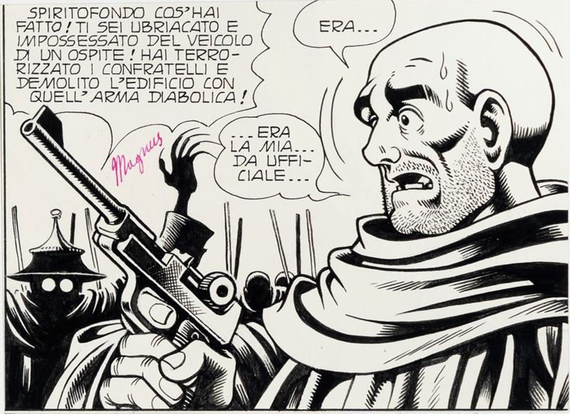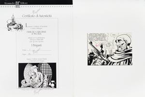 Vignetta originale realizzata da Magnus per "Ombre del palazzo" contenuta nell‘Atto I de I Briganti a pag. 32 e pubblicata per la prima volta dalla Edifumetto nel 1978. Opera racchiusa nel folder originale realizzato da Alessandro Editore come certificato d‘autenticità nel 2002. Firmata.