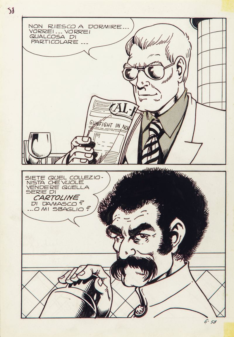 Tavola originale realizzata da Magnus per "Vacanze a Zahlè", edita su Lo Sconosciuto n. 6 a pag. 58 dalle Edizioni Del Vascello nel gennaio 1976. Prima opera di Magnus pubblicata dopo il divorzio artistico da Max Bunker, in cui il maestro bolognese riesce finalmente a dare sfogo alla sua creatività come autore indipendente.