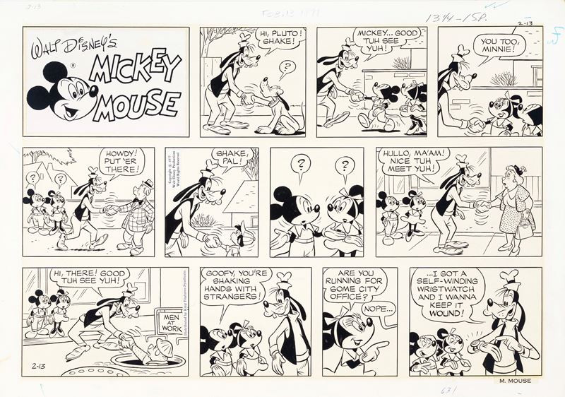 Tavola domenicale del 13/02/1977 per "Mickey Mouse". Succeduto a Gottfredson nel 1939 nella realizzazione delle tavole domenicali di Mickey Mouse, Gonzales terminò la sua carriera nel 1981.