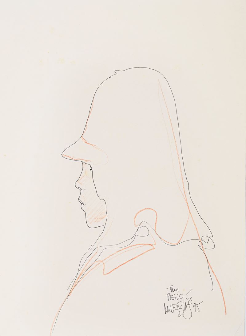 Disegno originale realizzato da Moebius durante la cerimonia del Premio U Giancu tenutasi a Rapallo nel 1995. Racchiuso in poche linee di china si può trovare il genio di uno dei più grandi visionari di tutti i tempi. Lieve piega all'angolo inferiore destro, lievi tracce di foxing. Firmato, datato e dedicato.