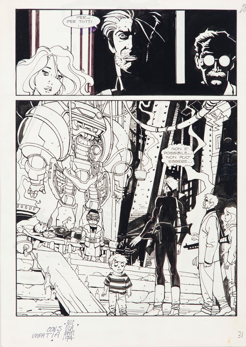 Tavola originale realizzata da Mari per "Uomini ombra", edita su Nathan Never n. 8 a pag. 31 dalla Bonelli 1992. Firmata, datata e dedicata.
